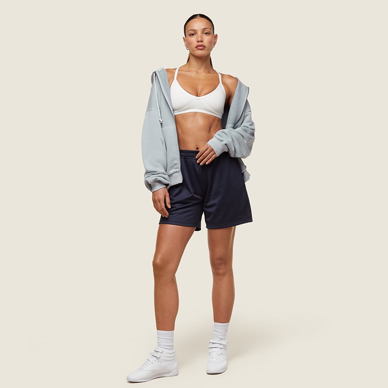 Our Varsity Mesh Shorts for that laid-back, nostalgic vibe. The basketball-style shorts are inspired by college days and have a longer line silhouette to play around with. We’re seeing the jort length shorts everywhere, and for women, these shorts look great when paired with a simple crop tank.
