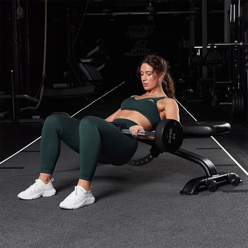 If you’re new to hip thrusts, start by using a light weight to get a feel for the movement. You could even use your bodyweight or a single dumbbell when you are just starting out before progressing to using the barbell.