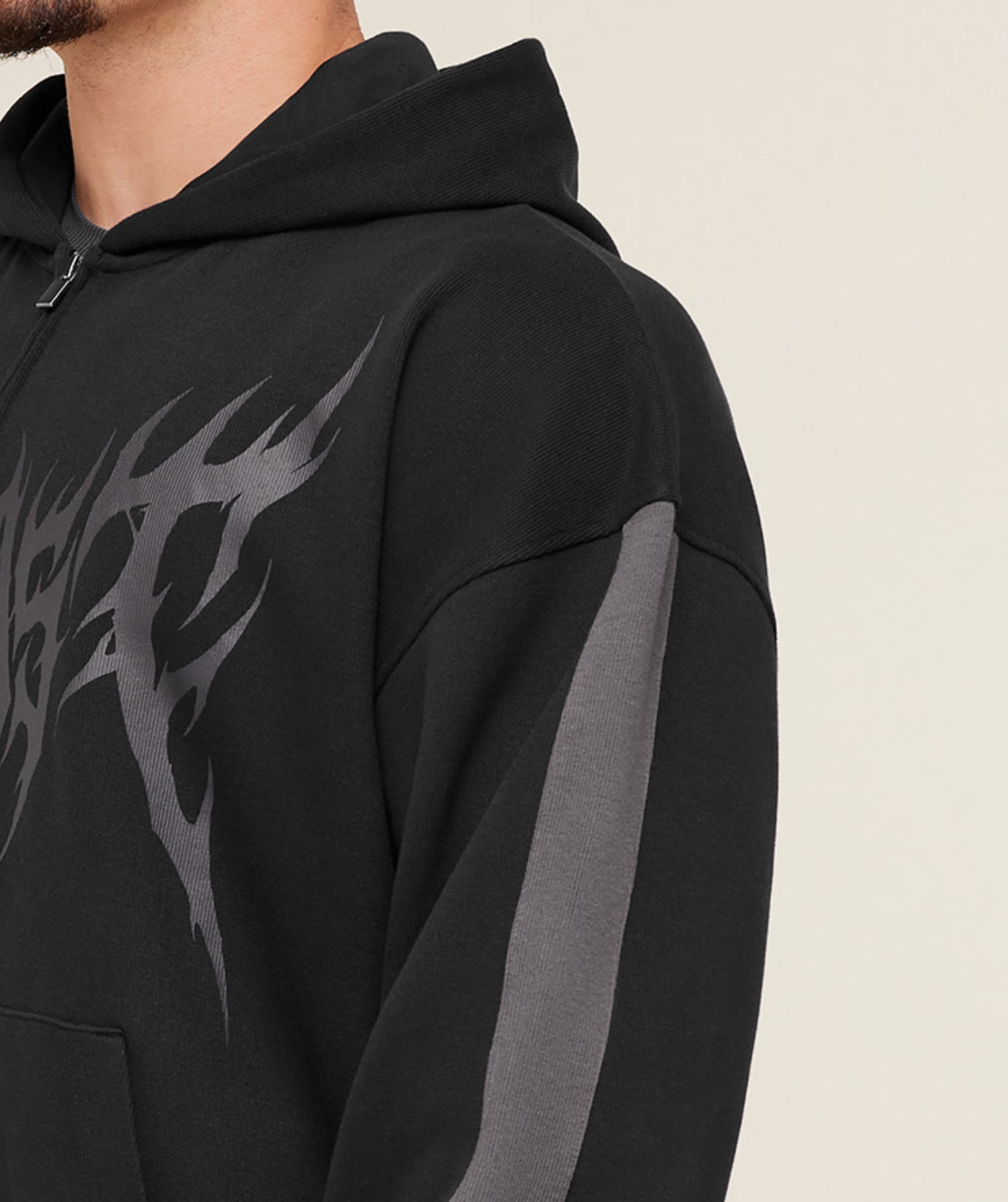 Sudadera con cremallera de ajuste extragrande, con gráfico de Carlos Belcast, paneles en contraste, capucha doble, bolsillo canguro y cierre completo.